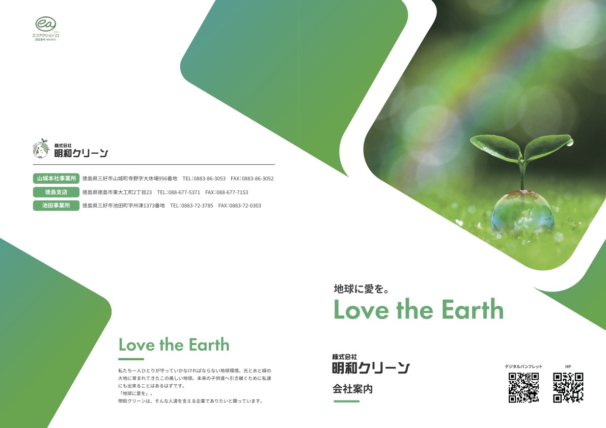 会社案内パンフレットは元々作成されていたが、 在庫が少なくなってきたためイメージを変えたものを作成してほしいとご相談いただきました。 産業廃棄物処理業のイメージをポップで身近に感じられるようなデザインにしたいとのご要望に沿って、 表面や中面の統一感を持たせたデザインにて作成させていただきました。
